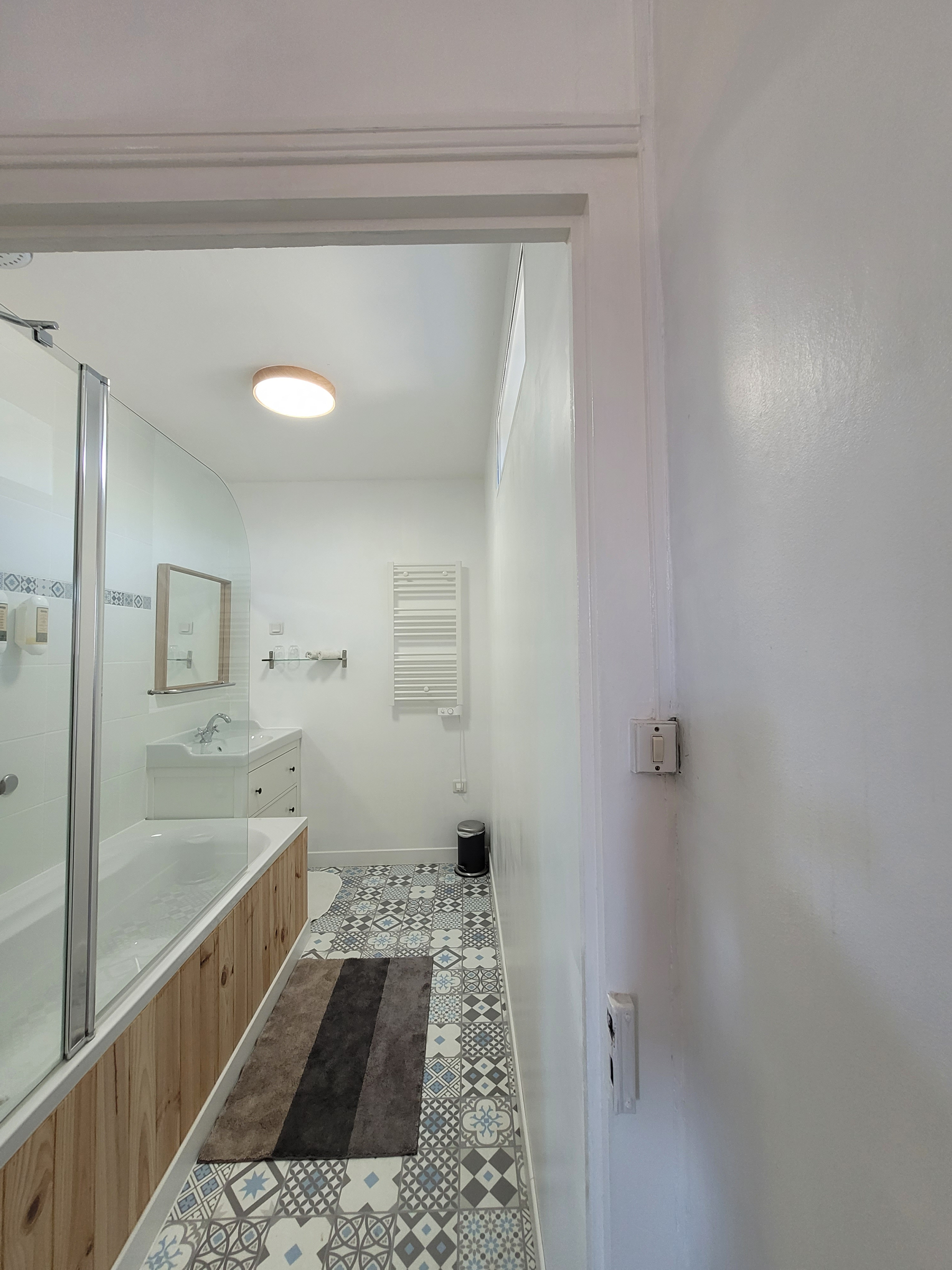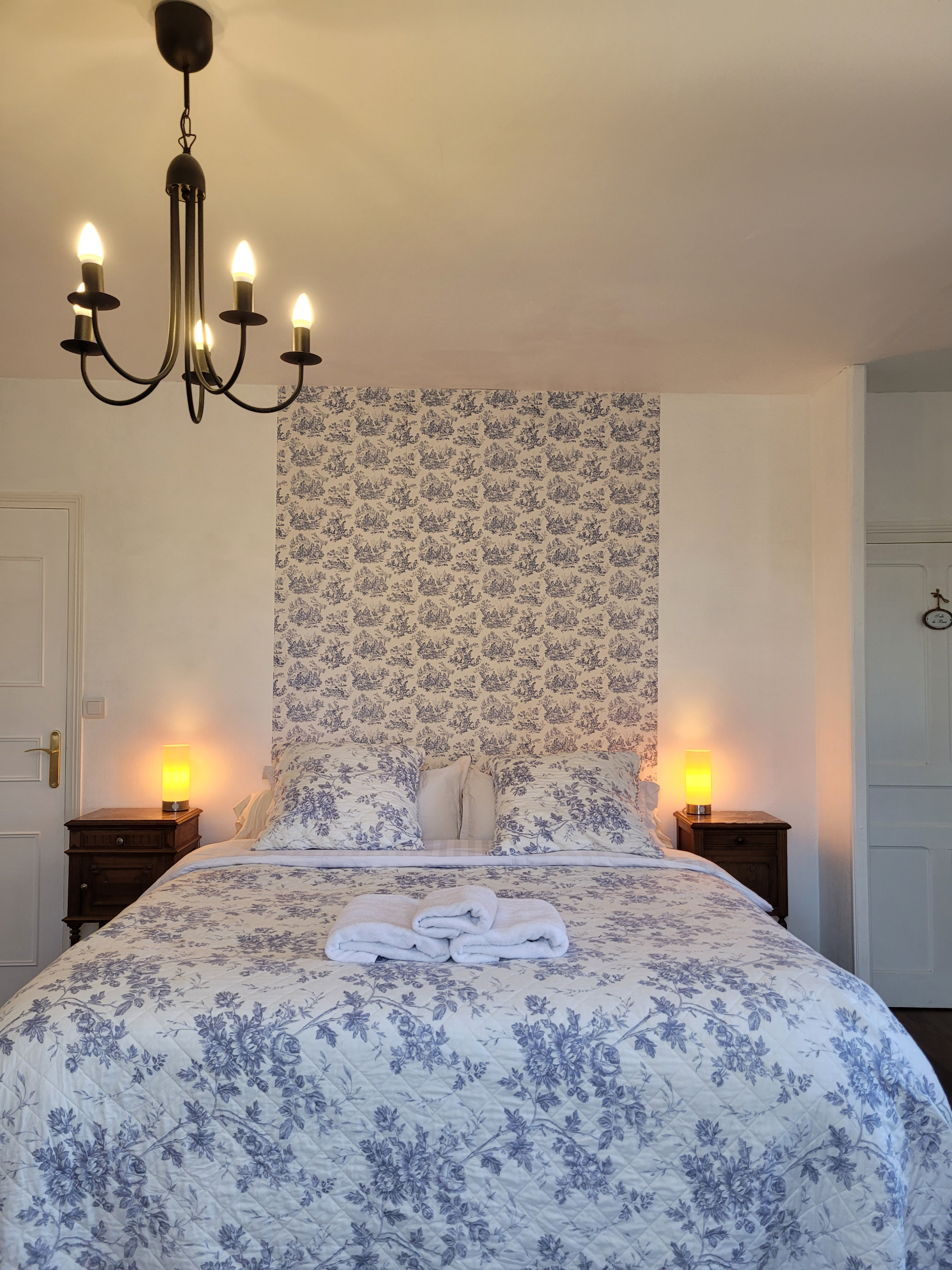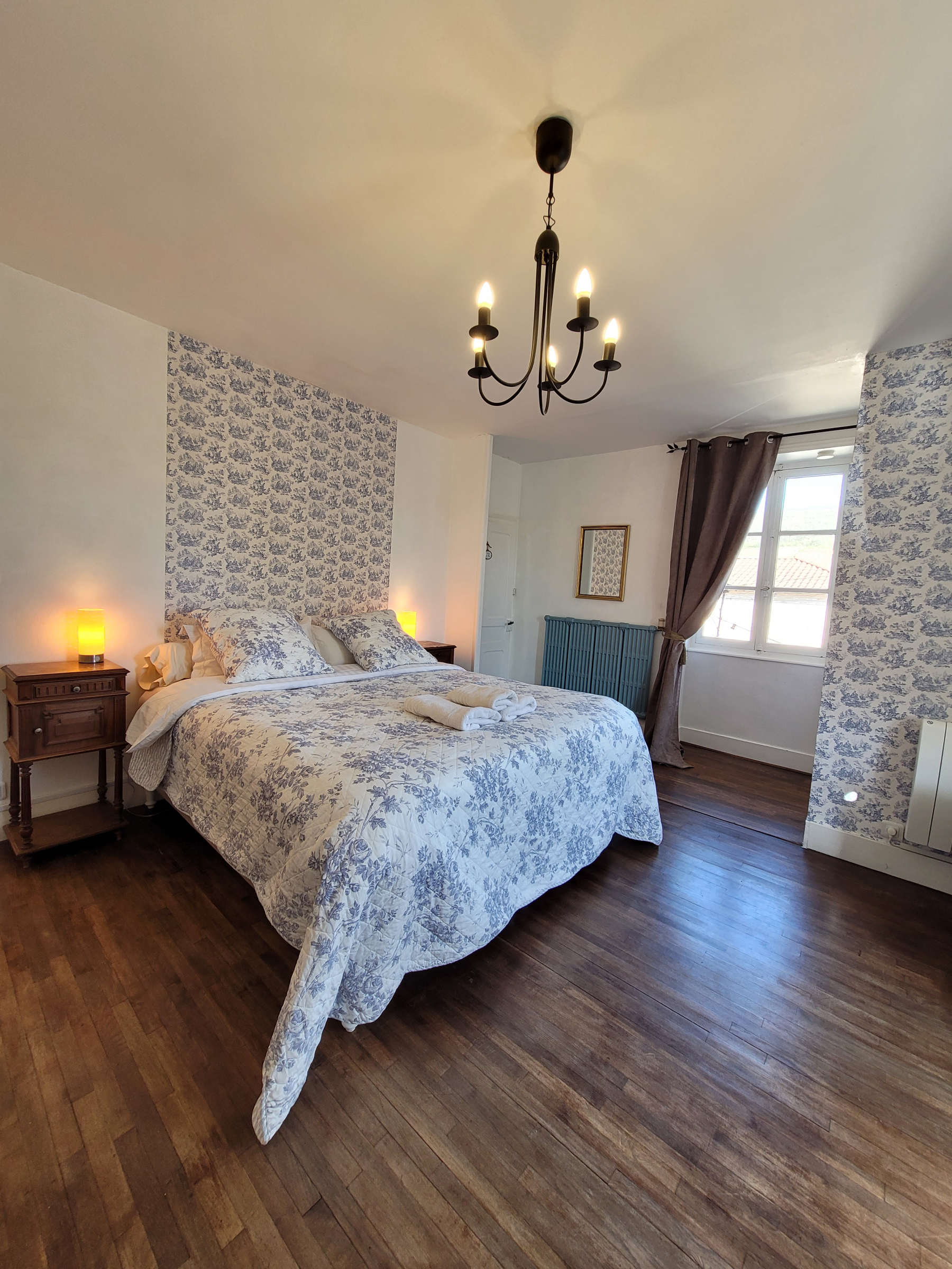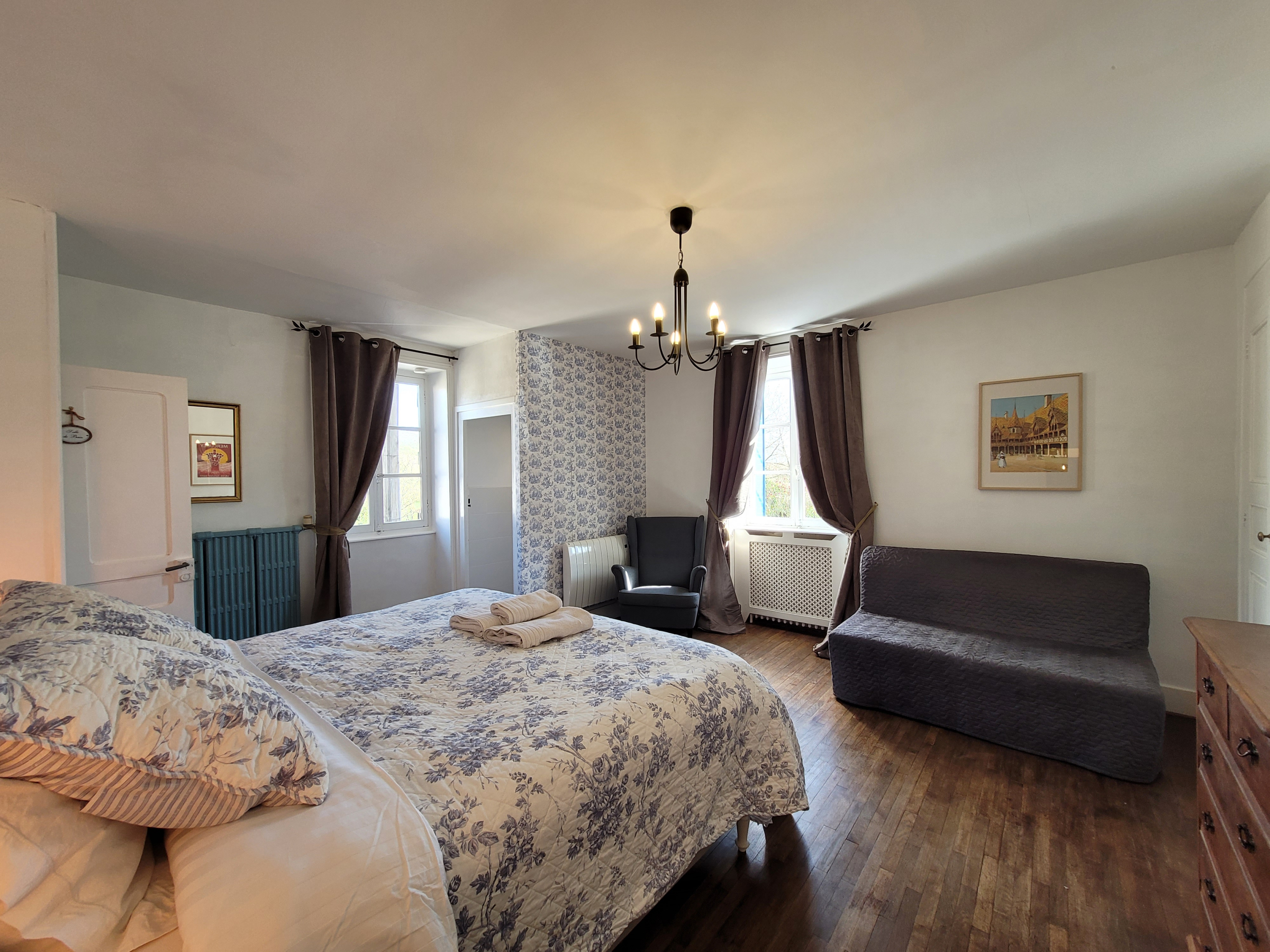 This room offers a king size bed and a sofa bed. A bathroom with bath and shower over and a toilet separate from the bathroom. This bright and sunny room offers a view over the courtyard and the village vineyards.
